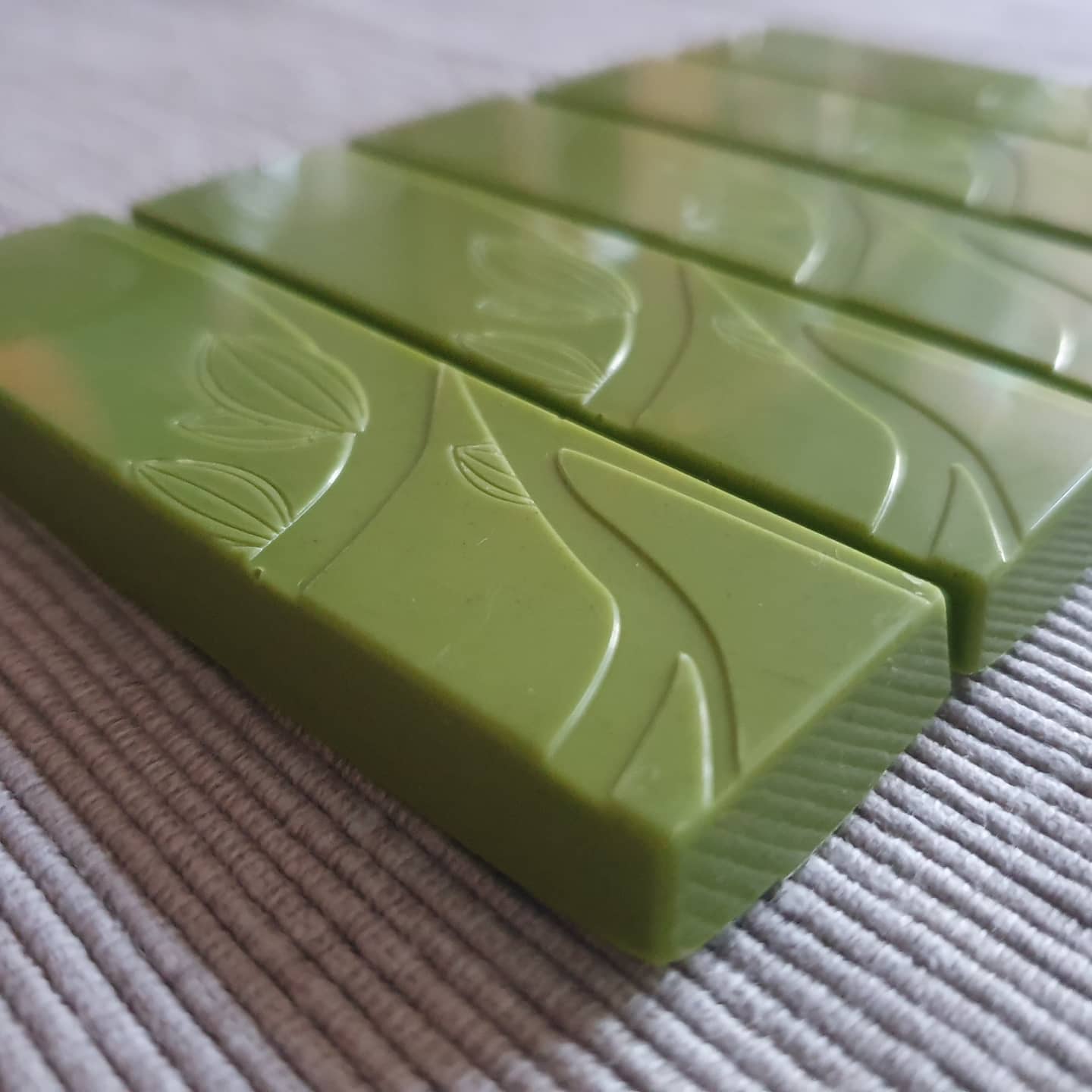Ingredients: White velvet chocolate, sugar, cocoa butter 32%, milk powder, soya lecithin, vanilla and green matcha tea powder.